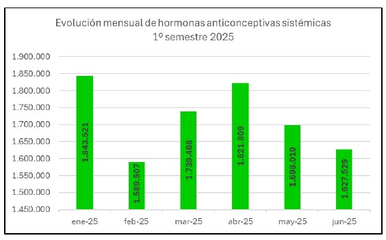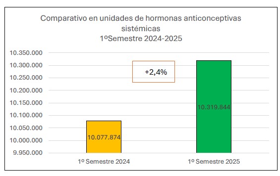 - En la comparación del primer semestre de 2025 con igual período de 2024, se evidencia un incremento del 2,4% en el consumo de hormonas anticonceptivas sistémicas.